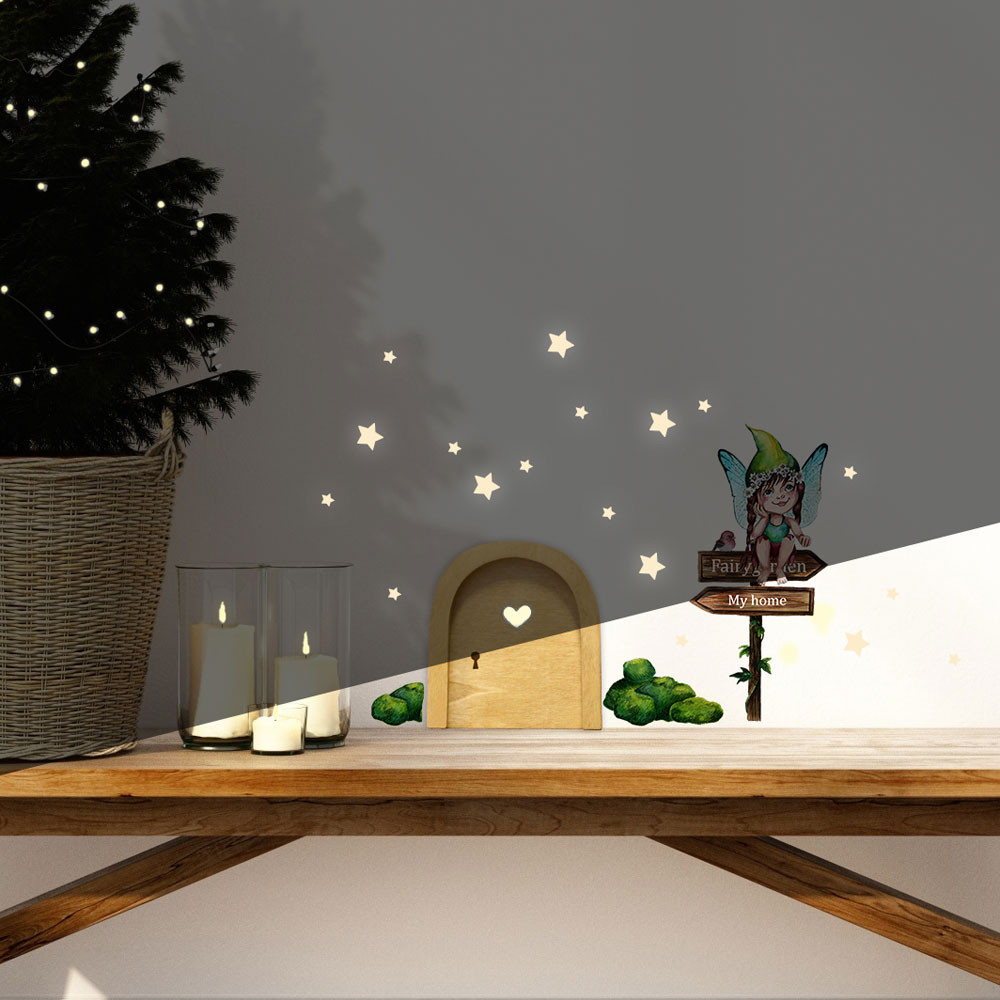 Elfentür Wichteltür Feentür Wandtattoo kleine Fee Elfe auf Schild mit Mooshügeln + Leuchtsticker e34