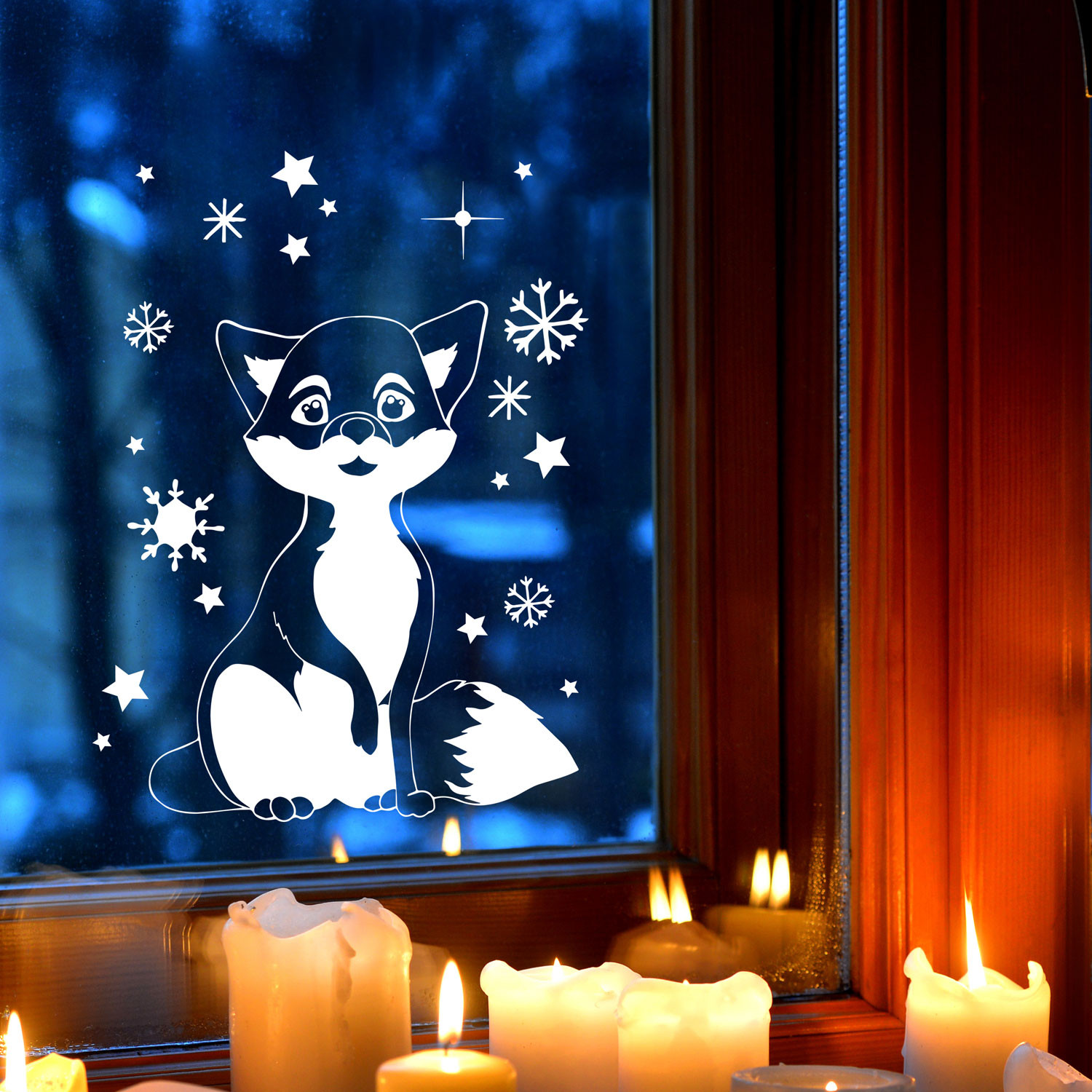 Fensterbild Fuchs im Schnee Fensterdeko Winterdeko Winterlandschaft + Schneeflocken & Sternchen selbstklebend M2403