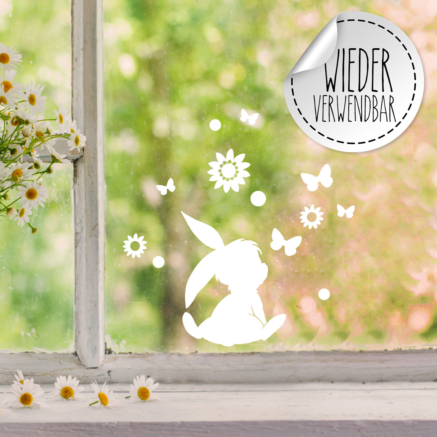 Fensterbild Hase mit Schmetterlinge, Blumen & Punkte wiederverwendbar Frühling Frühlingsdeko Ostern Osterdeko Fensterdeko selbstklebend Fensterbilder M2451