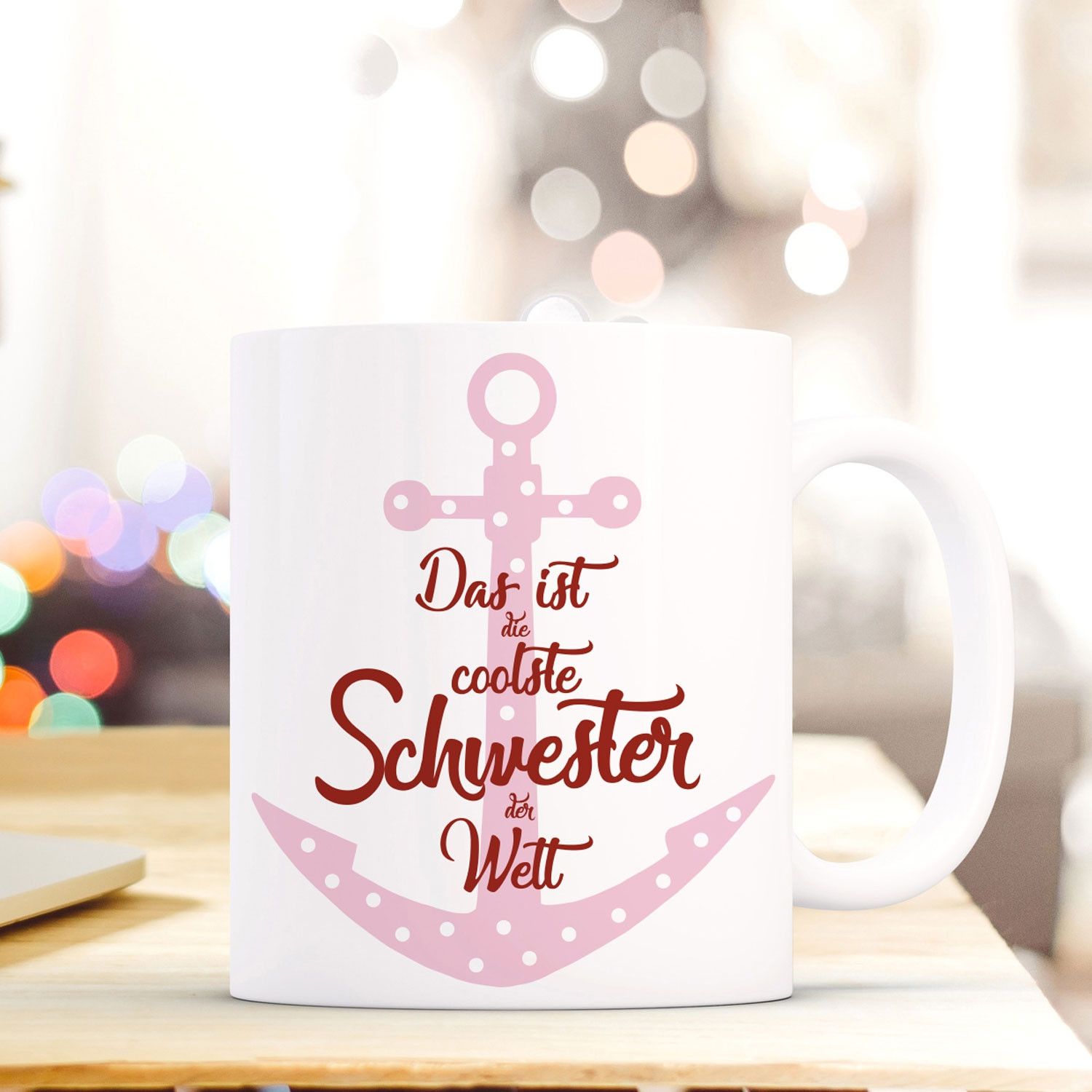 Süße Tasse in weiß mit Anker & Spruch "die coolste Schwester..." Geschenk Kaffeebecher Spruchtasse mit Motto Zitat ts559