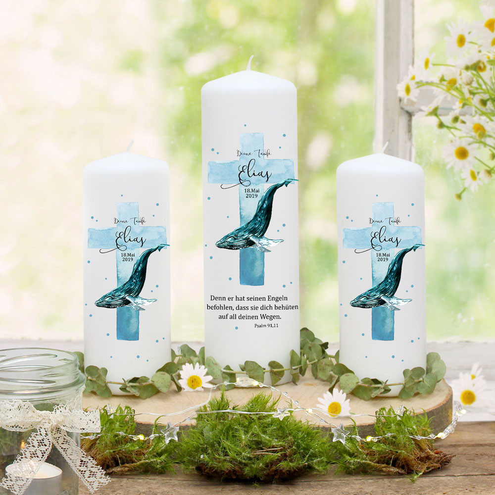 Taufkerze Kerze zur Taufe blaues Kreuz Wal Wunschname Spruch individualisierbar wk177