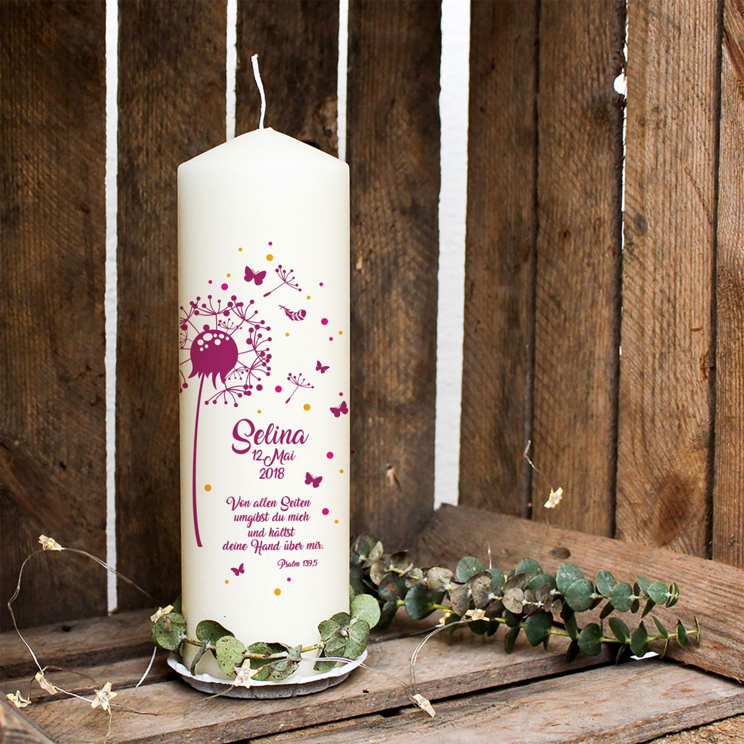 Taufkerze Kerze zur Taufe oder Geburt Kommunionkerze Pusteblume beere mit Spruch Wunschname & Datum wk44