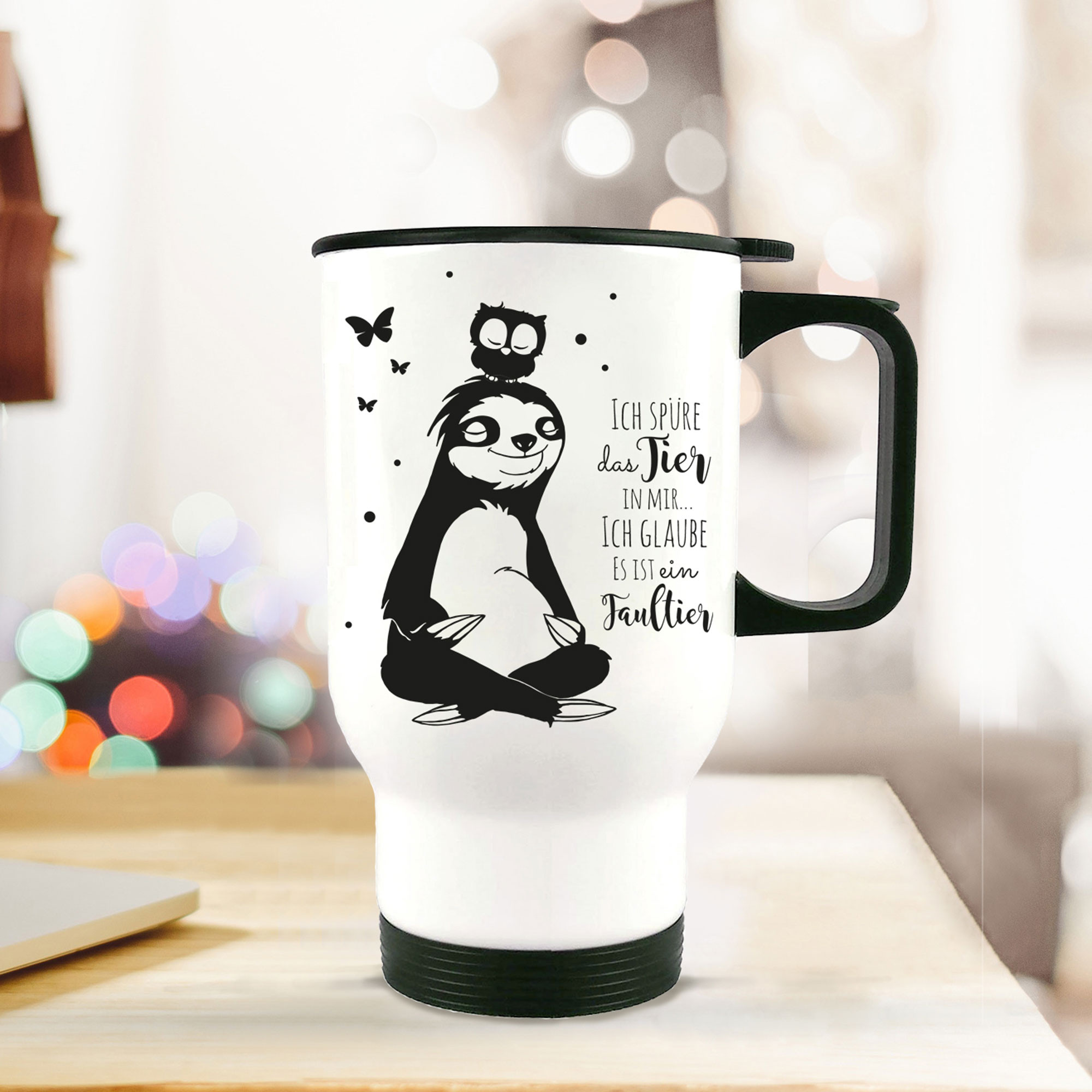 Thermobecher Faultier und Eule mit Spruch Ich spüre das Tier in mir...tb060