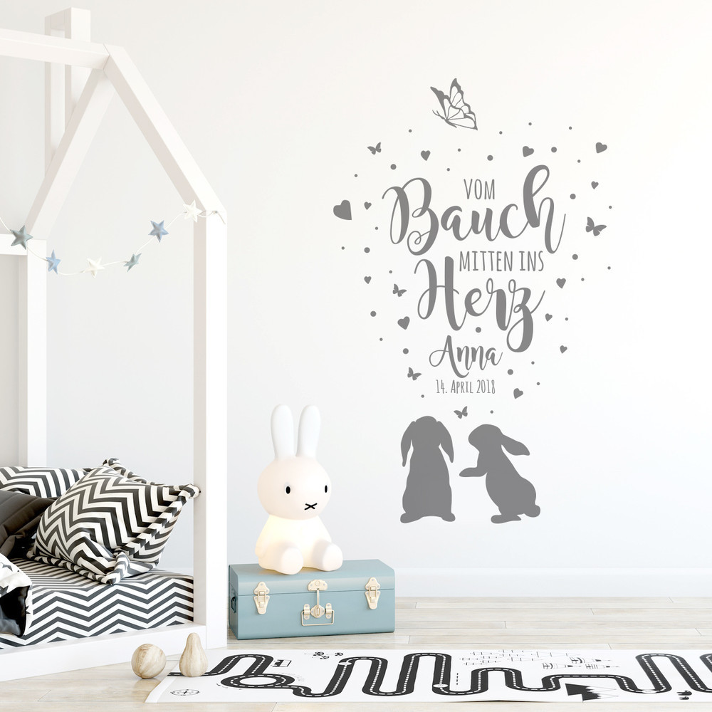 Wandtattoo Babyzimmer Spruch Zitat & Geburtsdaten Kinderzimmer Hasen Herzen & Schmetterlinge Wanddeko Wandgestaltung mit Namen & Datum M2340