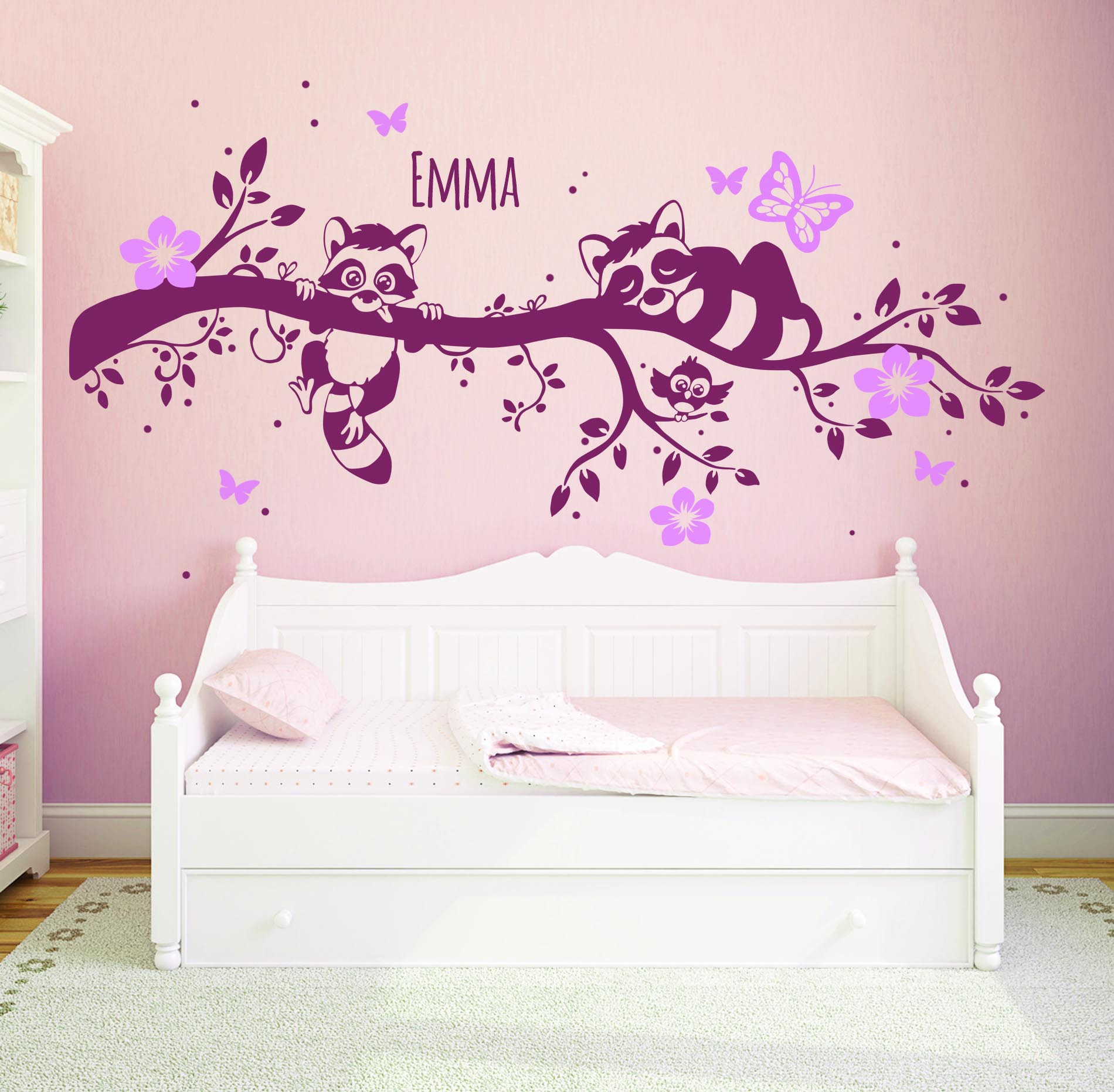 Wandtattoo Waschbären auf Zweig mit Schmetterlinge Blüten Eule und Wunschname zweifarbig M1541