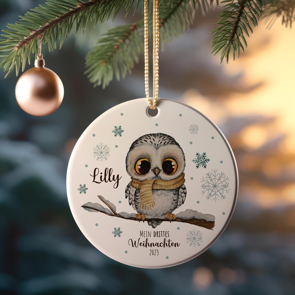 Weihnachtskugel Weihnachtsschmuck Keramik Baumanhänger personalisiert Mein drittes Weihnachten Namen Wunschname Eule auf Ast Tiere Baumkugel wkp38